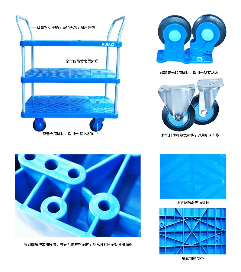 RUIAZI三层静音平板手推车,三层设计,高效作业,车板采用高性能树脂,使本产品的自重达到最轻量化,行走更加轻快,是一种平面运输设备,它能适合大多数条件下少量、小范围的临时短途运输;